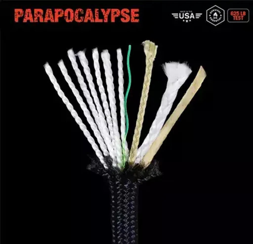 ➤➤ Paracord: Uses Atwood Parapocalypse survival paracord, which includes a basic 2x7 strand core and various functional cords as shown below.